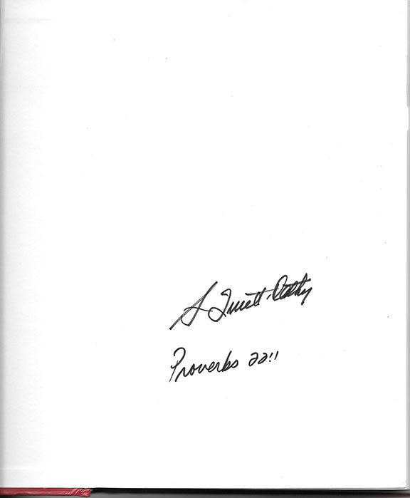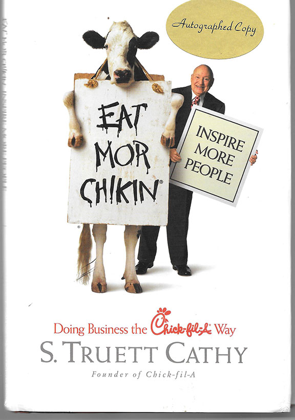 CATHY, S. Truett (1921-2014) American entrepreneur, founder of Chick-fil-A. In 1967 he opened his first Chick-fil-A restaurant which was unique in two ways. It served the first boneless breast chicken sandwich and it was the first fast food restaurant to operate in a shopping mall. There are more than 1,000 Chick-fil-A restaurants today. The book “Eat Mor Chikin”, Looking Glass Books, 2002, First Edition, two hundred pages, illustrated. Very good condition with dust jacket. On the front free endpaper the author has signed “S. Truett Cathy, Proverbs 22:1.”..............................$40.00