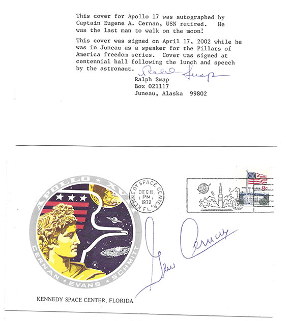 CERNAN, Eugene (1935-2017) American astronaut. Last man to walk on the moon. Attractive cover with a fine color cachet of the Apollo 17 emblem US 8 cent postage stamp with a meter stamp cancellation NASA Lift off, Kennedy Space Center, Dec 11, 1972. Perfect large hand signed signature “Gene Cernan.” Together with a “in person” COA from collector Ralph Swap. In very fine condition.................$295.00 |