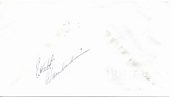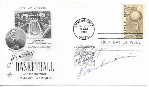 Enshrined in the Naismith Memorial Basketball Hall of Fame (1978). Very scarce First Day Cover commemorating Basketball and its inventor Dr. James Naismith. Fine cachet of Dr. Naismith and the Naismith Basketball Hall of Fame. Affixed is a Naismith 4 cent Basketball postage stamp cancelled Springfield, Mass. Nov 6, 1961. Hand signed “Wilt Chamberlain” across the lower portion of the cover. Signed once again on the verso. Signed items of this type by Chamberlain are seldom seen. Mint condition.........$675.00