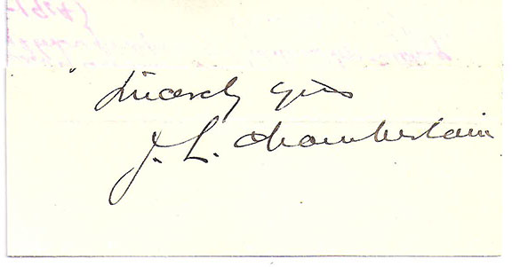 CHAMBERLAIN, J.L. (1828-1914). Union General, awarded the Medal of Honor for his gallantry at Gettysburg. Closing of a letter signed: “Sincerely yours, J.L. Chamberlain”. in fine condition.........................SOLD