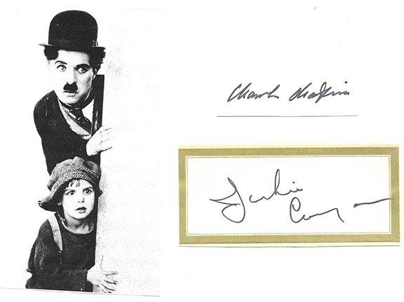 Coogan was one of the first child stars in silent films. He played the abandoned child raised by Chaplin’s Tramp character in “The Kid” (1921). Choice vintage signatures of both Charles Chaplin and Jackie Cogan both with ample margins for framing. ......................$850.00