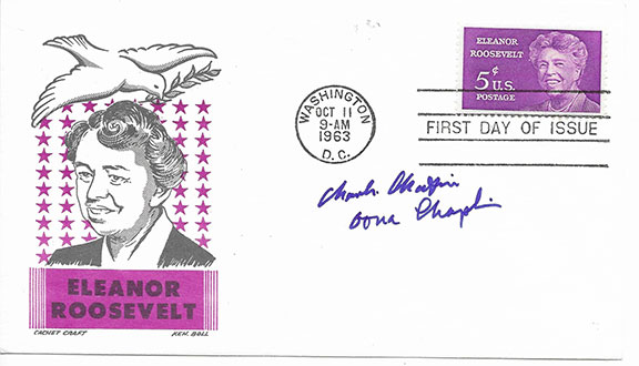 First Day of Issue cover commemorating Eleanor Roosevelt. Cachet of Eleanor Roosevelt and affixed to this cover is a U.S. 5 cent Eleanor Roosevelt postage stamp cancelled Washington D.C. OCT 11, 1963. Signed by both Charlie Chaplin and Oona Chaplin. In fine condition.....................$875.00