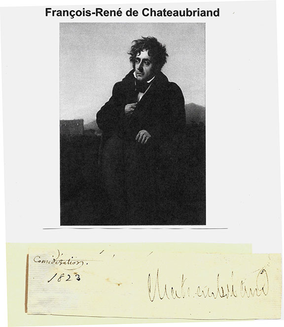 CHATEAUBRIAND, Francois Rene (1768-1848). French writer and statesman. Major figure in politics, food enthusiast. One of his popular books Memoirs from Beyond the Grave (1849-1850). He saw himself as the greatest lover, greatest writer and greatest philosopher of his age. He dominated the literary scene in France during the first half of the 19th century. Chateaubriand steak was names after him. Large signature “Chateaubriand” on a slip measuring 1.5”x6.25.” “Consideration 1823” written at the top left corner. Slip lightly affixed on one edge to another slip...........$185.00