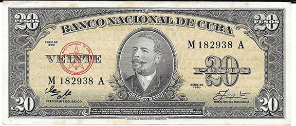 CHE GUEVARA. Ernesto Guevara de la Serna (1928-1967). Argentine revolutionary leader, trained as a doctor. Marxist guerrilla who aided Castro’s Cuban revolution in 1959. He rallied other third world countries to overthrow their corrupt regimes. He was President of the Banco Nacional De Cuba. He left Cuba in 1965 to become a guerrilla leader in South America. He was captured in 1967 during a campaign in Bolivia. He was executed by firing squad. He was transformed into a martyr. Cuban 20 pesos Note, Banco Nacional De Cuba, printed signature of Che as President Del Banco. Above his printed signature he has personally signed his name using a black ink pen. Very scarce as such, only a few of these notes have appeared for sale. Note and signature in fine condition.................SOLD