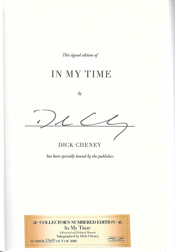 CHENEY, Dick (1941- ) 46th Vice-President of the United States. 17th Secretary of Defense and Acting President of the United States on June 29, 2002 from 7:09 AM-9:24AM. The powers of the presidency was passed onto him while President George W. Bush was under sedation for a colon screening. Bush decided to transfer the powers to Cheney out of extra caution because the nation is at war. His book with Liz Cheney “In My Time” A Personal and Political Memoir. Threshold Editions, New York, 2011, First Edition. 565 pages, illustrations in color. This signed edition has been specially bound by the publisher. Collector’s Numbered and signed edition, copy 3569 out of 5000 copies. COA from Premier Collectibles tipped to the first free endpaper. A fine copy with the dust jacket.................................$95.00