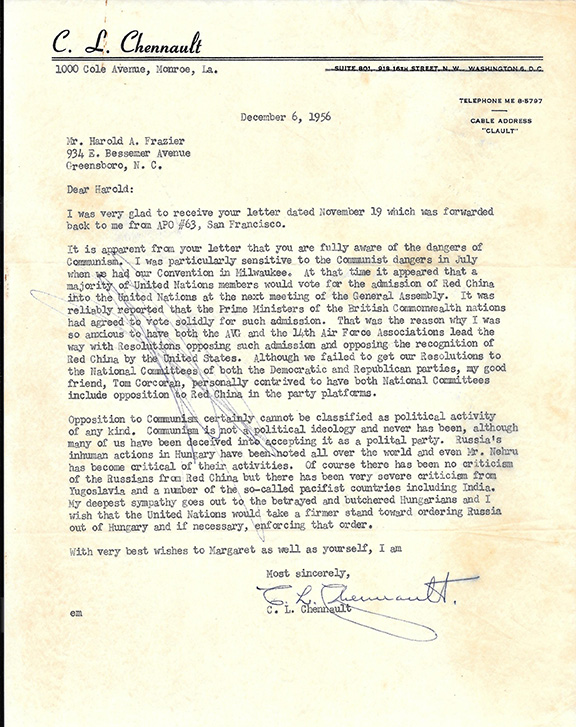 CHENNAULT, Claire (1893-1958). Founder of the American Volunteer Group (AVG Flying Tigers) in China. He became Air Advisor to Chiang Kai-Shek. Lengthy T.L.S. on his name imprinted stationery. Monroe, LA, Dec. 6, 1956. In part: “...you are fully aware of the dangers of Communism. I was particularly sensitive to the Communist dangers in July when we had our Convention in Milwaukee. At that time it appeared that a majority of United Nations members would vote for the admission of Red China into the United Nations at the next meeting of the General Assembly. It was reliably reported that the Prime Ministers of the British Commonwealth nations had agreed to vote solidly for such admission. That was the reason why I was so anxious to have both the AVG and the 14th Air Force Associations lead the way with Resolutions opposing such admission and opposing the recognition of Red China by the United States...Opposition to Communism certainly cannot be classified as political activity of any kind. Communism is not a political ideology and never has been, although many of us have been deceived into accepting it as a political party. Russia’s inhuman actions in Hungary have been noted all over the world and even Mr. Nehru has become critical of their activities. Of course there has been no criticism of the Russian’s from Red China but there has been very severe criticism from Yugoslavia and a number of the so-called pacifist countries including India. My deepest sympathy goes out to the betrayed and butchered Hungarians and I wish that the United Nations would take a firmer stand toward ordering Russia out of Hungary and if necessary, enforcing that order...” This letter has minor damp staining to the right side barely detracting its appearance. Apparently Chennault tested the ink in his pen before signing the letter and a few scrawls of ink run across some text. Still a very attractive example with a fine blue ink signature “C.L. Chennault”. Autographs of Chennault are among the scarcest of the great American leaders of WWII. Letters of any kind from Chennault are particularly scarce and those with this content can be considered rare....................SOLD