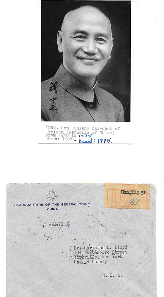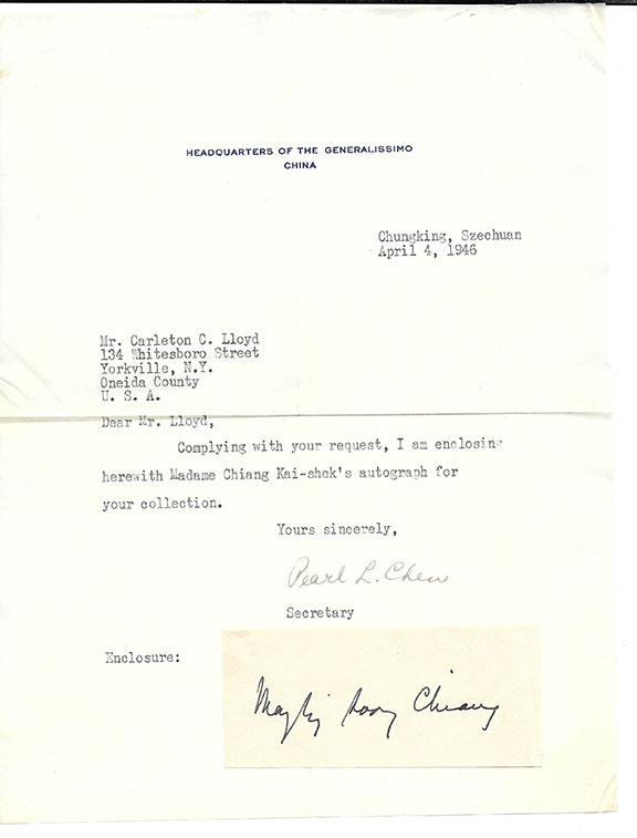 President and First Lady of China MAYLING SOONG CHIANG (1898-2003). Chinese political figure, author, First Lady of the Republic of China. Her life extended into three centuries. Photograph of Chiang Kai-Shek, postcard size, B&W, head & shoulders pose, full face, smiling. Boldly signed in Chinese. Biographical information written on the lower white border easily matted out. Included is a choice full signature of Mayling Soong Chiang, In addition is a letter of transmittal from Madame Chiang’s secretary sending the signature. The letter is dated April 4, 1946, with original heavily stamped envelope. The four items....................SOLD ![]() |