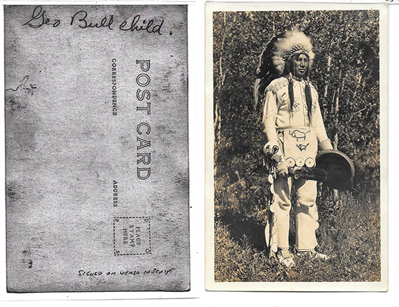 Chief Bull Child.  American Indian Chief. Postcard photograph, B&W, full length pose in full Indian dress. Signed in pictograph, in pencil with excellent contrast. On the verso the Chief had signed once again in script. A V/F example..........