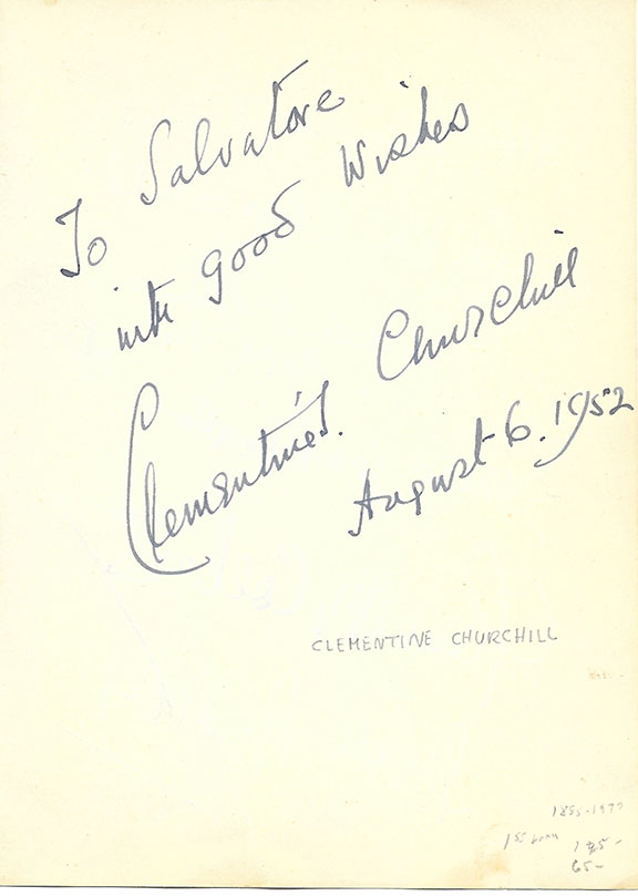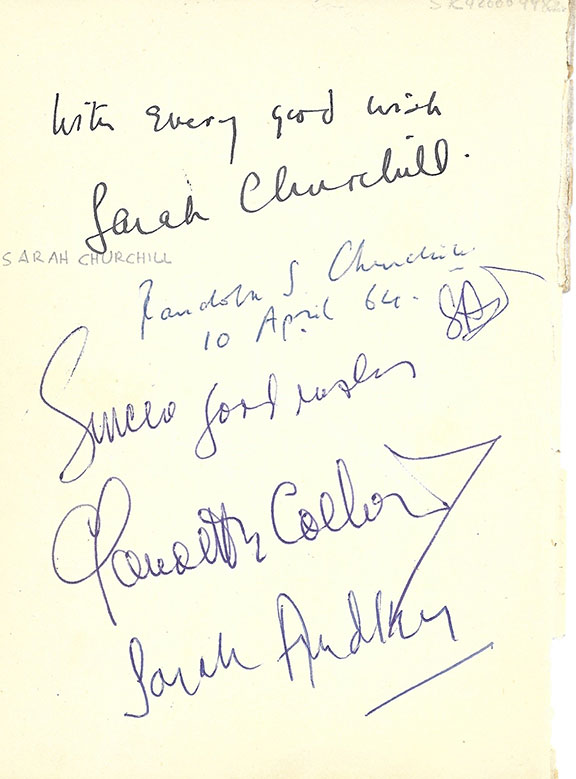 CHURCHILL, Randolph (1911-1968). English journalist, writer and politician. Only son of Winston Churchill. He had a reputation for being rude and having a drunken behavior. He outlived his father by only three years. Album page, 5”x6.5” Inscribed and signed: “To Salvatore with good wishes Clementine Churchill August 6, 1952. On the verso is signed with a sentiment: “with every good wish Sarah Churchill.” Just below is signed and dated: “Randolph S. Churchill 10 April 64.” Below is signed by actress: “Sincere good wishes Claudett Colbert” and one other. In very good condition ..................................$147.50