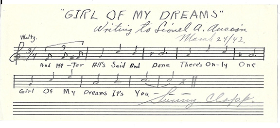 CLAPP, Charles “Sunny” (1899-1962). Composer, bandleader. Best known for his writing the music and words to “Girl of My Dreams” (1927). It was a charming old-fashioned hit especially with barber shop quartets. AMuQs, Clapp has written two lines of music and the words to his hit song “Girl of My Dreams” on printed music paper measuring 3.75”x9”. He has identified the piece and inscribed, signed and dated it “March 24/42”. Anything signed by Clapp is uncommon......$175.00![]() |