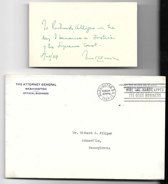 CLARK, Tom C. (1899-1977). President Truman nominated Clark for the position of Associate Justice of the U.S. Supreme Court in 1949. He held this position until 1967. Clark voted on many civil rights cases. Autograph note signed on his first day as Justice. On a 3”x5” card Clarke writes: “To Richard Alliger on the day I became a Justice of the Supreme Court, Tom C. Clark. 8/24/49.”Together with the original The Attorney General envelope. It is obvious he did not get his own stationery on his first day. Both items in fine condition............ $225.00