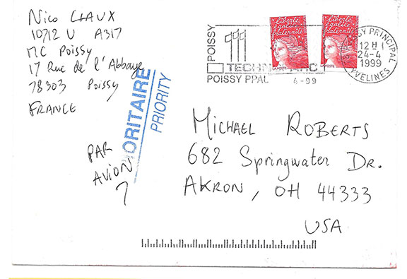 CLAUX, Nico (1972- ) Killer, cannibal, grave robber in Paris. He stole bones and mutilated mummified remains and ate human flesh when he worked at a morgue. He said human flesh tastes like horse meat. He murdered a person in 1994 in front of the Moulin Rouge. He is believed to be responsible for the murder of six others. Found guilty of one count of murder, one count of armed robbery and 3 counts of grave robbery. He was sentenced to 12 years in prison in Poissy PPal, France. Cover mailed from prison, two French stamps cancelled in 1999. Claux has signed his name and return address at the top left corner of the envelope. Very fine condition..............$37.50