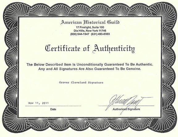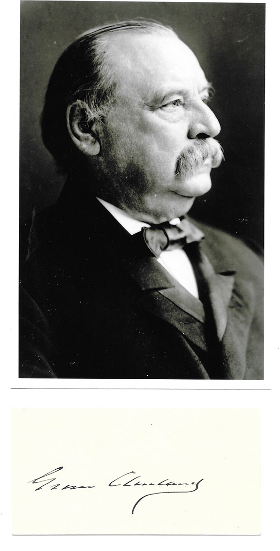 CLEVELAND, Grover (1837-1908). Twenty second President of the United States (1885-1897) and twenty fourth President of the United States (1893-1897). Choice dark signature on a 2”x3.5” card. Together with a COA from American Historical Guild...........$250.00 |