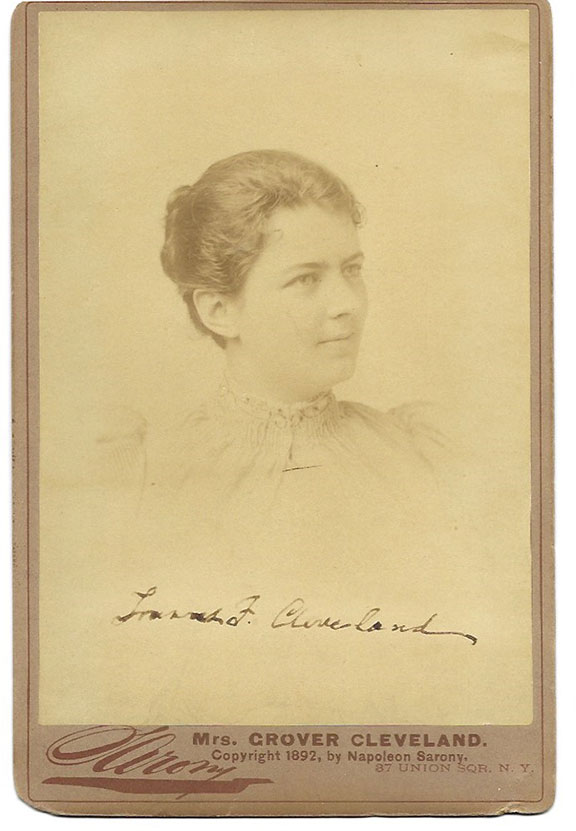 CLEVELAND, Francis F.  (1864-1947)  First Lady of the United States.  Scarce cabinet photograph by Napoleon Sarony. Copyright 1892.  Head and shoulders pose, slight profile, boldly signed “Francis F. Cleveland.” In very good condition