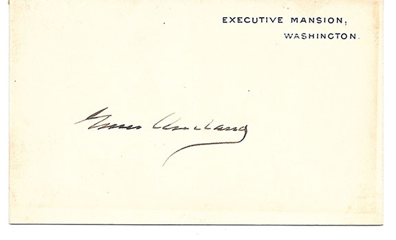 CLEVELAND, Grover (1837-1908). Twenty second President of the United States (1885-1897) and twenty fourth President of the United States (1893-1897). Official Executive Mansion. Washington card from his first administration, variant #2 with Executive Mansion. Washington printed at the top right side. In near fine condition with very light toning around the edges and light mounting traces at the very top of verso. Nice bold signature. The prices of all signed Executive Mansion cards have been skyrocketing..........$450.00