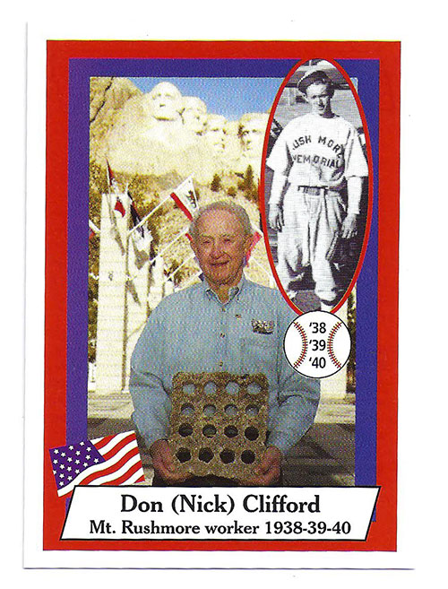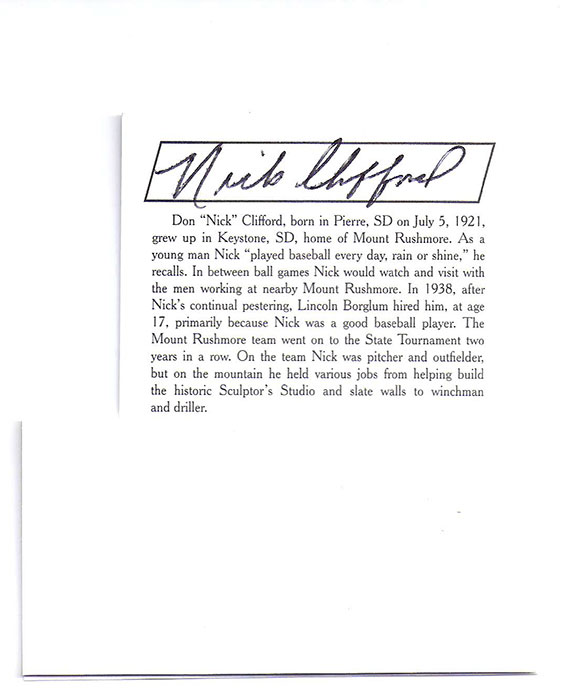 CLIFFORD, Don (1921-    ) Mount Rushmore carver from 1938-1940. Hired at the age of 17. On the project he helped build the Sculptor’s Studio, slate walls and was a winch man and driller.  Baseball card size color portrait of Don Clifford standing in front of the Mt. Rushmore memorial holding stone with holes that he drilled. Hand signed on the verso......................................$22.50