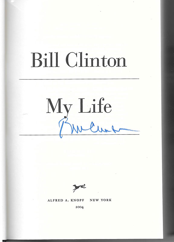 CLINTON, Bill (1946- ) Democratic politician, Governor of Arkansas, 42nd President of the United States (1993-2001). His book: “My Life” A.A. Knopf, 2004, First Edition, so stated. 957 pages, illustrated, in very fine condition with the dust jacket. Signed by Bill Clinton on the title page in blue ink..................$395.00 |