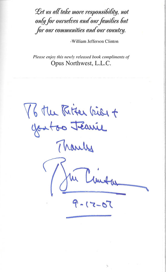 CLINTON, Bill (1946- ) Democratic politician, Governor of Arkansas, 42nd President of the United States (1993-2001). His book: Giving, How Each Of Us Can Change The World. Alfred A. Knopf, N.Y. 2007, First Edition, 240pages. Inscribed, signed and dated on the front free endpaper: “To the Ritter(?) you too Jeanie Thanks Bill Clinton - 9/17/07.” Above the presentation inscription affixed is a plate with a printed quote from Bill Clinton. Book and dust jacket in fine condition...........SOLD
