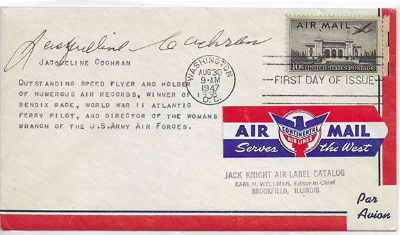 COCHRAN, Jacqueline (1910-1980). 20hth century test pilot who was an advocate for aviators (female) during WWII. Speed flyer and record holder of many air records. Director of the Woman Branch of the U.S. Army Air Forces. Choice Air Mail cover, FDC commemorating Continental Air Lines Air Mail Service. Affixed is a U.S. 10-cent Air Mail postage stamp cancelled First Day of Issue, Washington, DC , AUG 30, 1947. Nice hand signed signature of Jacqueline Cochran over 4 inches long. Signatures of Cochran are not common. In fine condition...................$145.00