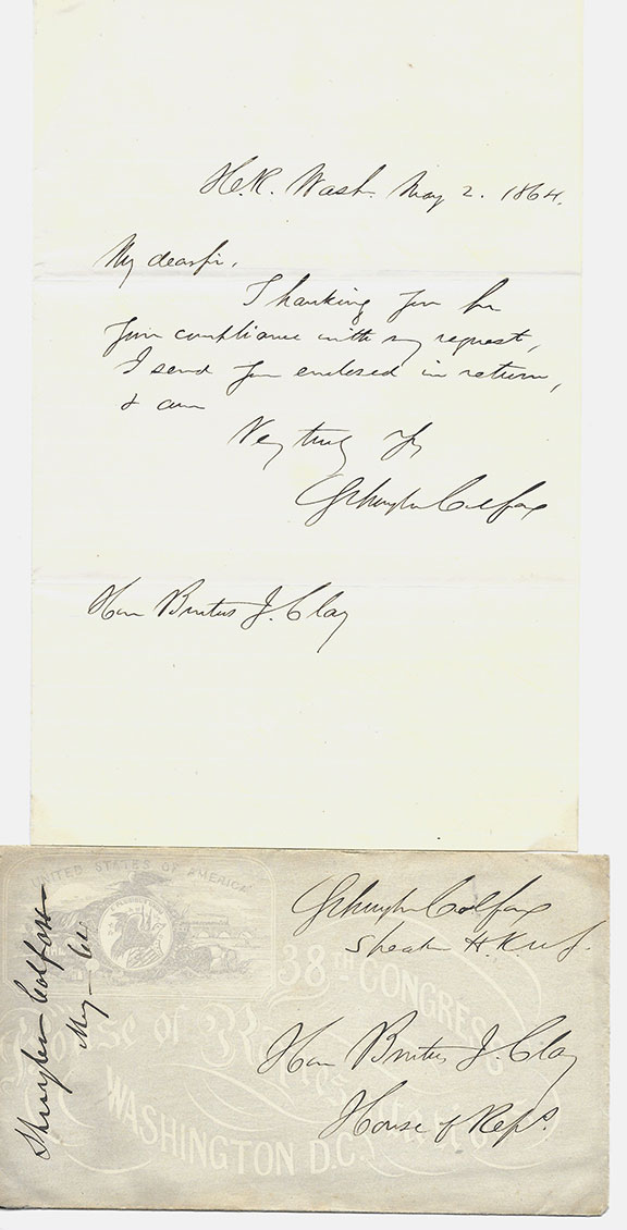 COLFAX, Schuyler (1823-1885). Vice-President of the United States under U.S. Grant. He led the effort to pass the 13th Amendment to the U.S. Constitution which abolished slavery. He was implicated in the Credit Mobilier Scandal, and as a result ended his career. A wonderful autograph letter signed, one page HR (House of Representatives) May 2, 1864. To Hon Brutis Clay. Colfax sends thanks “for your compliance with a request, I send you enclosed in return...” Complete with an attractive /ornate 38th Congress House of Representative cover filled out in Colfax’s hand and free franked “Schuyler Colfax, Speaker H of R.” Both items in V/G-Fine condition ..................................$275.00