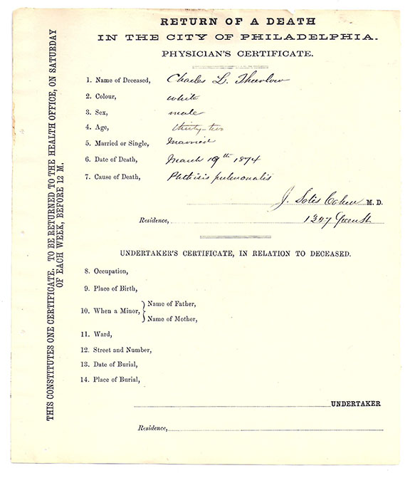 COHEN, Jacob Da Silva Solis (1838-1927). Jewish American physician. Expert in the use of the laryngoscope. During the Civil war he served as Assistant Surgeon in the 26th Pennsylvania infantry (1861). Acting Assistant Surgeon to the United States Navy (1861-64). He was the Visiting Surgeon to the Army Hospitals in Philadelphia until the war’s end. In 1867, Dr. Cohen became the first American to perform a successful laryngotomy for removal of a cancerous growth. In 1882, Cohen helped to establish the Philadelphia Polyclinic and College for Graduates in Medicine. Cohen published several works on diseases of the throat. Very scarce Physician’s Certificate of Death, Philadelphia, March 4, 1874 for a 32 year old white male. Filled in and signed by J. Solis Cohen. A very unusual medical item...........$125.00