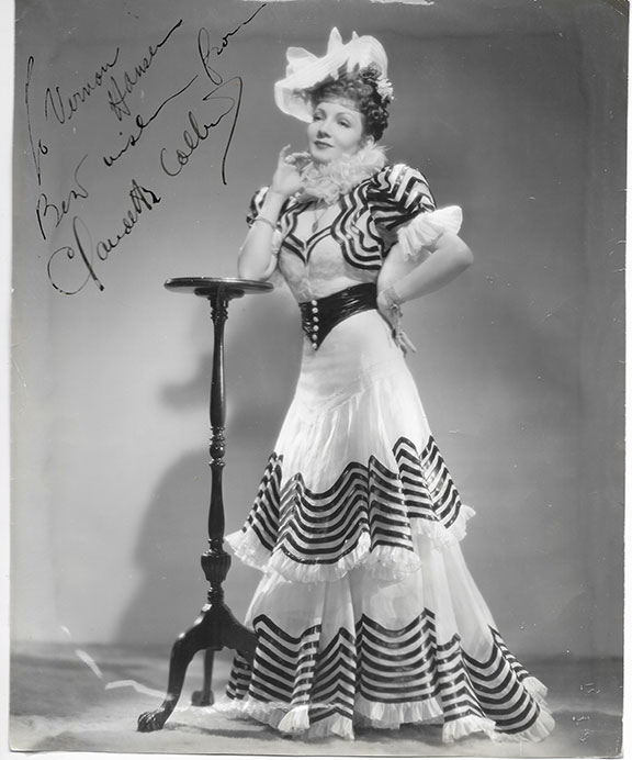 COLBERT, Claudette (1903-1996) American leading lady. Began her career on Broadway during the 1920’s before turning to motion pictures. Photograph, 7.5”x9” lovely full- length portrait of Colbert from the film “Zaza.” She is wearing the frills of the early 1900’s. She sings and dances the can-can. Inscribed: “To Vernon Hansen, Best wishes from Claudette Colbert.” Rippling along all four edges from removal of prior mounting.....................$125.00![]() |