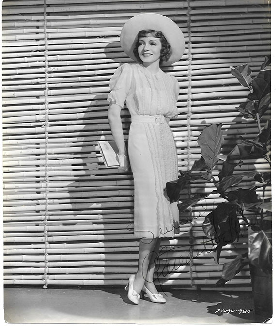 COLBERT, Claudette (1902-1994). American leading lady Began her career on Broadway during the 1920’s. She progressed into motion pictures. Photograph 7.5”x9”, full length pose from Paramount’s Bluebeard’s Eighth Wife. Her dress is designed by Travis Banton. Narrow rows of “val” lace accent the front of her skirt. Short puffed sleeves introduces a fragile pleated treatment. A broad brimmed hat of pale blue milan, short white gloves and a large white envelope purse completes the outfit. Signed with a one word sentiment: “Sincerely Claudette Colbert.” Last name in a darker area but readable. V/G condition...........$95.00
