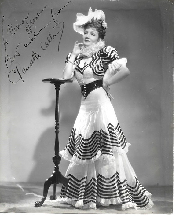 COLBERT, Claudette (1902-1994). American leading lady Began her career on Broadway during the 1920’s. She progressed into motion pictures. Photograph 7.5”x9”, full length pose from Paramount’s Zaza. She wears the frills of the early 1900’s, sings and dances the can-can in which she stars. Inscribed and signed: “To Vernon Hansen Best wishes from Claudette Colbert.” Rippling along the edges otherwise in good condition...........SOLD![]() |