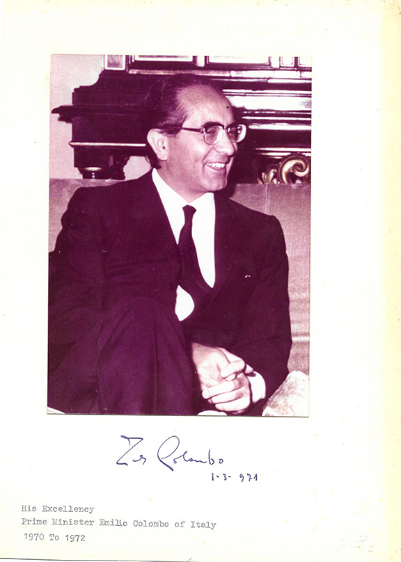 COLOMBO, Emilio (1920-2013). Prime Minister of Italy (1970-1972), He held many top positions in government since 1943. President of European Parliament (1977-1979). Color photograph, half-length pose, smiling. Affixed to a larger photographer’s mount. Signed and dated as Prime Minister, A nice example............$65.00