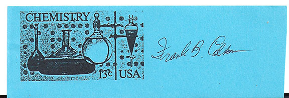 COLTON, Frank B. (1923-2003). American scientist who in 1952 was first to synthesized Norethynodrel, the progestin used in Envoid, the first oral contraceptive. In 1953, he synthesized Norethandrolone and approved in 1956 as the first oral anabolic steroid. In 1988 he was inducted into the National Inventors Hall of Fame. Blue slip, 2”x6” with a printed Chemistry cachet, signed in full............ $27.50 |