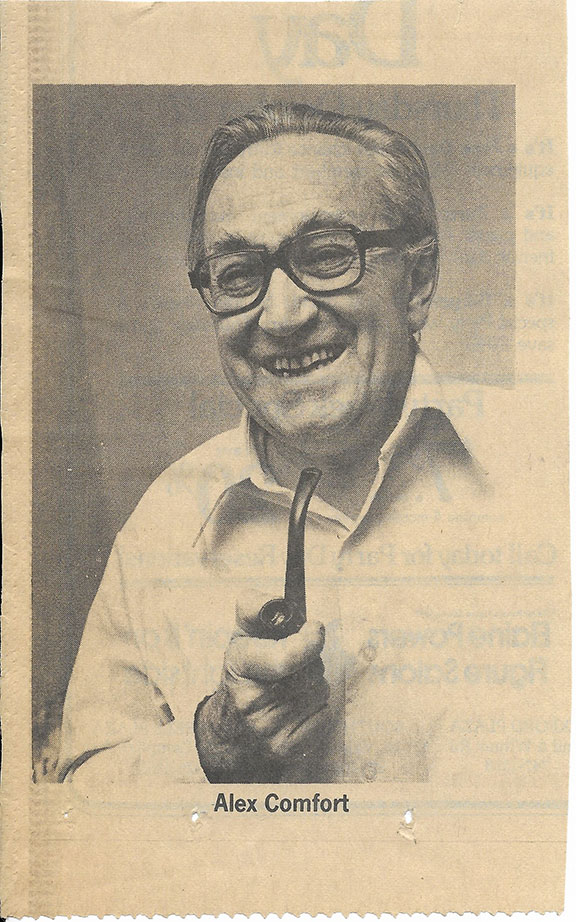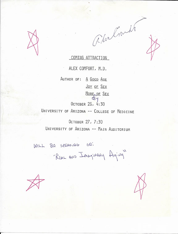 COMFORT, Alex (1920-2000) British scientist, physician author. Best known for his worldwide bestselling book The Joy of Sex (1972). He was a conscientious objector during WWII. He was imprisoned for not continuing to organize a protest in Trafalgar Square. Flyer: Coming Attraction Alex Comfort, Oct 26, University of Arizona – College of Medicine. Comfort has signed his name and corrected the title of one of his books then adding in his hand: “Will Be Speaking On: Real and Imaginary Aging”. Together with a newspaper portrait. Both in fine condition. The signature of Alex Comfort is very, very scarce. A similar item a while back was selling for $699.00. Out price ......................................$225.00