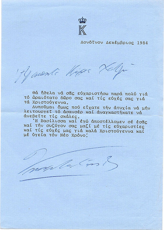 Typed letter in Greek, on his Royal letterhead, 1984. Not translated. Hand addressed and hand signed. In fine condition............$75.00