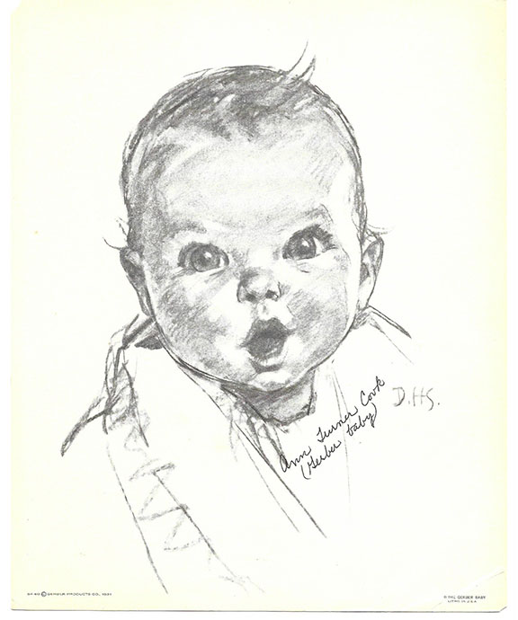 COOK, Ann Turner (1926- ) American mystery writer and model. At the age of 4 months old, a charcoal sketch of her by Dorothy Hope Smith was submitted to Gerber Baby Foods. The sketch was chosen and copyrighted in 1931. Cook became the face on all Gerber Baby products. Lithograph “The Gerber Baby” copyright 1931, B&W, 8”x10” of the Gerber Baby, had signed “Ann Turner Cook Gerber Baby.” In V/G condition...................67.50