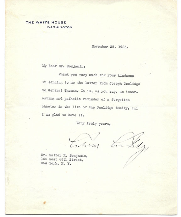 Typed letter signed, one page, November 28, 1925 on the imprinted letterhead of The White House, Washington. Coolidge writes: "My Dear Mr. Benjamin, Thank you very much for your kindness in sending me the letter from Joseph Coolidge to General Thomas. It is, as you say, an interesting and pathetic reminder of a forgotten chapter in the life of the Coolidge family, and I am glad to have it. Very Truly yours, "