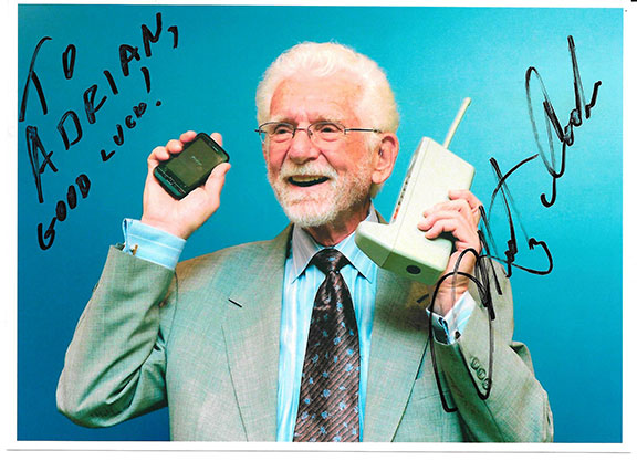 COOPER, Dr. Martin (1928- ) Inventor. While working at Motorola in the 1970’s he invented the handheld mobile phone. He is known as the “Father of the Cell Phone.” Choice color photograph of Cooper, measuring 5”x7” , half length pose of Cooper holding up his first cell phone and a newer model of the cell phone. Inscribed and signed: “To Adrian, Good luck, Martin Cooper.” In very fine condition and not a common autograph...........................$95.00