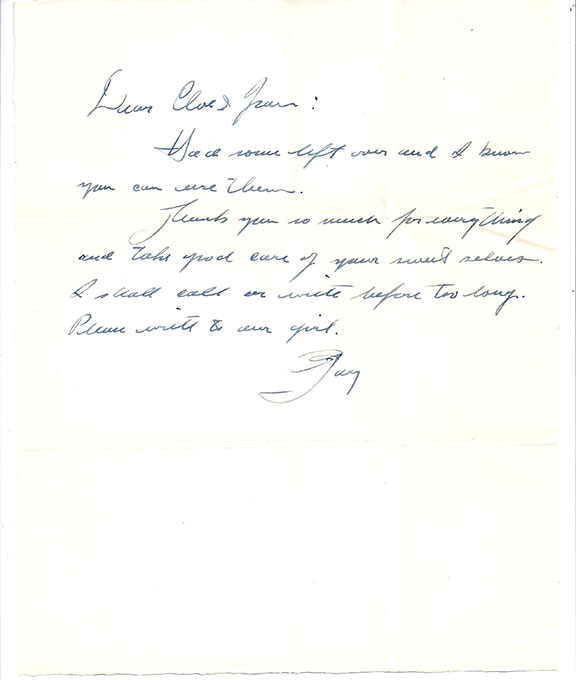 COOPER, Gary (1901-1961). American film actor, leading man. Winner of Academy Awards for his part in Sergeant York (1941) and for High Noon (1962). Autograph letter signed, one page, no date. Very friendly letter to “Dear Cloe and Fran”. Cooper writes: “Had some left over and I know you can use them. Thank you so much for everything and take good care of your sweet selves. I shall call or write before too long. Please write to our girl”. Signed “Gary”............... SOLD