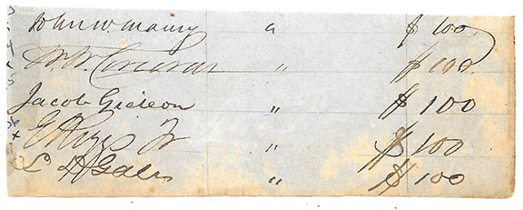 CORCORAN, W.W. (1798-1888). American financier and banker. In 1836 he opened a note brokerage house, an early form of a bank. During 1837, businessmen including Elisha Riggs shielded the Corcoran Brokerage House from collapse during the economic panic. In 1840, Corcoran and G.W. Riggs (Elisha’s son) formed Corcoran & Riggs, a partnership that offers depository and checking services. During 1842, John Tyler becomes the first president to bank at Corcoran Bank. In 1842, this firm establishes itself at the old United States Bank in Washington. During 1845, Corcoran & Riggs financed Samuel Morse’s invention of the telegraph. Twenty-two presidents and family’s including Abraham Lincoln banked at Riggs. A slip removed from a book containing signatures of prominent person’s who lived in Washington, D.C. Each has donated $100.00 to an enterprise. Two of the signatures are of Elisha Riggs, Jr. and W.W. Corcoran. Most likely unique, the first time we have seen both these signatures on the same item. In fine condition ...................................$195.00