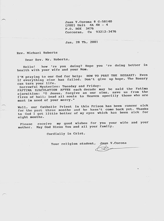 Corcoran, CA, Jan. 28, 2001. To Rev. Michael Roberts, Corona writes in part: “...I’m praying to our God for help: How to pray the Rosaary; Even if everything else has failed.....Fatima Ejaculation After each decade may be said the Fatima ejaculation: ‘O Jesus, forgive as our sins, save us from the fires of hall; lead all souls to Heaven specially those who are must im need of your mercy......”