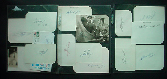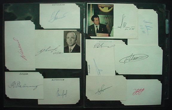 COSMONAUTS Of all the world’s space travelers up to and including just a few years ago, the top 29 pioneers who spent the most time in space are the Russian Cosmonauts. Number 30 is an American who spent only 84.05 days in space. Musa Manarov in the course of two space flights spent a total of 541.02 days in space. Number 2 was J.V. Romanenko who spent a total of 430.76 days in space. This collection consists of the signatures mostly on cards of 27 of the top 29 Cosmonauts who spent the most time in space. The following Cosmonauts have signed and are listed in order of time in space. M. Manarov, J.V. Romanenko, L. Kizim, V. Titov, V.A. Solovjov, V, Rjumin, V. Ljachov, A. Alexandrov, V.P. Savinych, V.V. Poljakov, O.J. Atkov, V.V. Lebedev, V.V. Koyaljonok, A.A. Volkov, A.N. Berezovoj, L. Popov, A.J. Solovjov, A.N. Balandin, A. Serebrov, V.M. Afanasjev, A.S. Viktorenko, A.J. Lavejkin, G.M. Strekalov, S.K. Krikaljov, A.S. Ivancenkov, V.A. Dzanibekov, A. Arcebarskij. A most difficult collection to complete. Many genuine Cosmonaut autographs were difficult to acquire and this collection is a most unusual offering............. $895.00