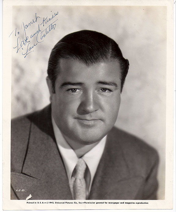 COSTELLO, Lou (1906-1959). U.S. Comedian, with his partner Bud Abbott made numerous comedy films during the 40’s & 50’s. Their skit “Who’s On First” is simply unforgettable. Fabulous publicity photograph, 8’X10”, B&W, head & shoulders pose, full face, close-up looking directly into the camera. Inscribed and signed on the clear area of the background: “To Janet, Love & Kisses, Lou Costello”. Copyright 1945, Universal pictures Co., Inc. An excellent vintage example.............................. $395.00