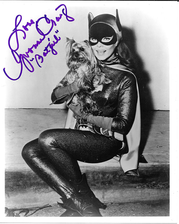 Wonderful off camera frequent visitor on the Batman set is Sebastian, a Yorkshire terrier belonging to Craig. Photograph, 8”x10”, B&W, full length of Craig as Batgirl holding her beloved terrier. She has signed: “Love Yvonne Craig Batgirl.” Together with an 8”x10” B&W photograph, full length of Adam West as Batman. Signed: “A.West.” Both items in excellent condition................$150.00