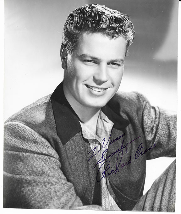 CRANE, Richard (1918-1969). Veteran character actor whose career spanned three decades. Best known for his role as Rocky Jones, Space Ranger. Vintage photograph, borderless, B&W, 7.25”x9” half length pose smiling. Inscribed and signed: “To Vernon Sincerely Richard Crane. In fine condition.........$125.00![]() |