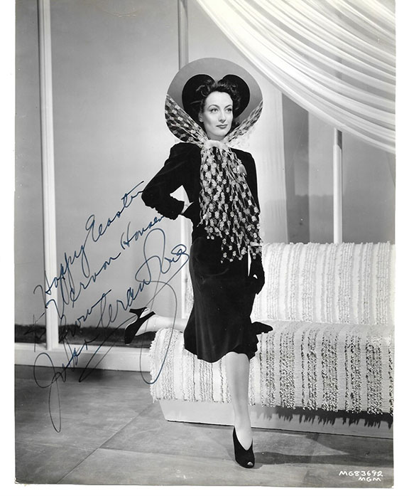 CRAWFORD, Joan (1909-1977). Major star of the screen. Academy Award winner for Best Actress in Mildred Pierce (1945). Vintage MGM photograph, borderless, 7”x9” full length pose extravagant outfit, full length pose inscribed: “Happy Easter Vernon Hansen from Joan Crawford.” Light mounting traces on verso otherwise in fine condition........$225.00![]() |