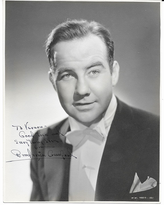 CRAWFORD, Broderick (1911-1986). Character actor, stage, film, radio and TV personality. He was cast in tough guy roles. Oscar for portrayal of Willie Stark in All The Kings men (1949). He is also known for his role in Highway Patrol 91955-1959). He appeared in over 90 films. Wonderful card stock vintage photograph, 7.5”x9.5”, B&W, head & shoulders pose. Inscribed and signed in fountain pen: “To Vernon- Good Luck and everything else from Broderick Crawford.” In very fine to choice condition.........SOLD