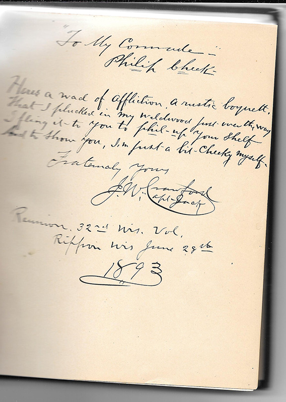 CRAWFORD, Captain Jack (1847-1917). Known as The Poet Scout. Fought in the Civil War where he was wounded. Appointed Captain of the Black Hills Rangers Militia. He replaced Buffalo Bill as Chief of Scouts of the 5th Cavalry only two months after the Custer massacre, Worked in Buffalo Bill’s Wild West Show. His book: “The Poet Scout” The Price-McGill Company, 1891, one hundred eighty-one pages, illustrated. On the second leaf Crawford has inscribed and signed and dated the book adding a poem: “To My Comrade Philip Cheek, Here’s a wad of affliction, a rustic boquett, That I plucked in my wildwood from over the way. I fling it to you to phil up your shelf , And to show you, I’m just a bit-cheecky myself. Fraternaly yours, J.W. Crawford, Capt. Jack Reunion 32nd Wis. Vol. Rippon, Wis, June 28th, 1893”. Some wear to top & bottom of spine and front hinge on front cover otherwise a good copy. An excellent inscription and poem by Captain Jack Crawford ..................................SOLD