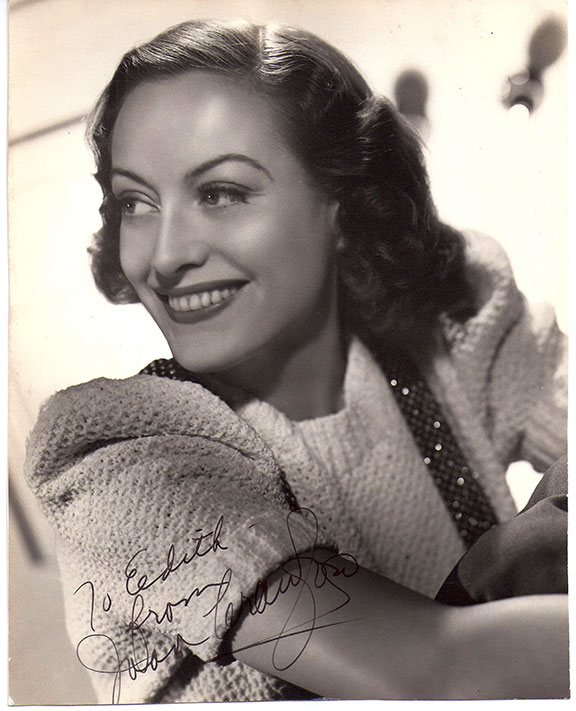 CRAWFORD, Joan (1906-1977). Legendary actress. Winner of the Academy Award for Mildred Pierce (1945). MGM Vintage photograph, 7.5”x9.5”, B&W, head and shoulders pose, looking to the side and smiling. Boldly inscribed and signed: “To Edith from Joan Crawford”. Vintage photographs signed by this great star are seldom encountered. This is a lovely example, circa 1938...............SOLD