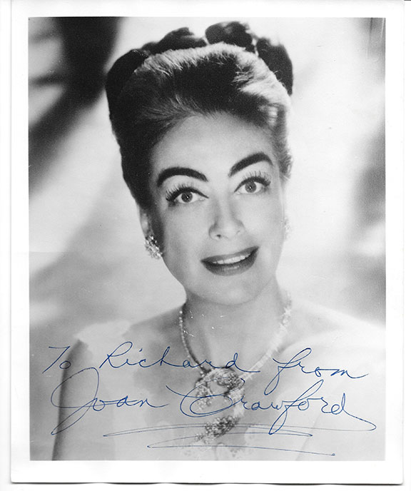 CRAWFORD, Joan (1904-1977). American film and television actress. She is near the top of the list of Greatest Female Stars of the Classic Hollywood Cinema. Proclaimed to be the first “Queen of the Movies”. In 1938 she was dubbed “Box Office Poison”. Winner of the Academy Award for “Mildred Pierce”. Photograph, B&W, head and shoulders pose smiling. Inscribed and signed: “To Richard from Joan Crawford”. Her signature is almost seven inches long. Notations on verso stated photograph was signed in 1969...................$135.00