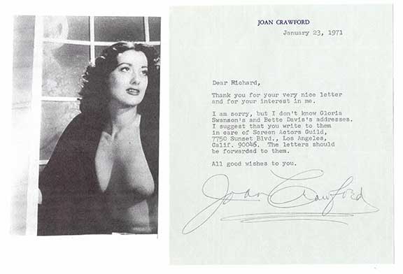 CRAWFORD, Joan (1904-1977). American film and television actress. She is near the top of the list of Greatest Female Stars of the Classic Hollywood Cinema. Proclaimed the First “Queen of the Movies”. In 1938 she was dubbed “Box Office Poison”. Winner of an Academy Award for her part in “Mildred Pierce”. Typed letter signed on her name imprinted letterhead. Dated January 23, 1971, responding to a request for the addresses of Gloria Swanson and Bette Davis. Choice signature five and one half inches long. Together with a very scarce busty topless, reproduced photograph of Crawford. The two.............SOLD