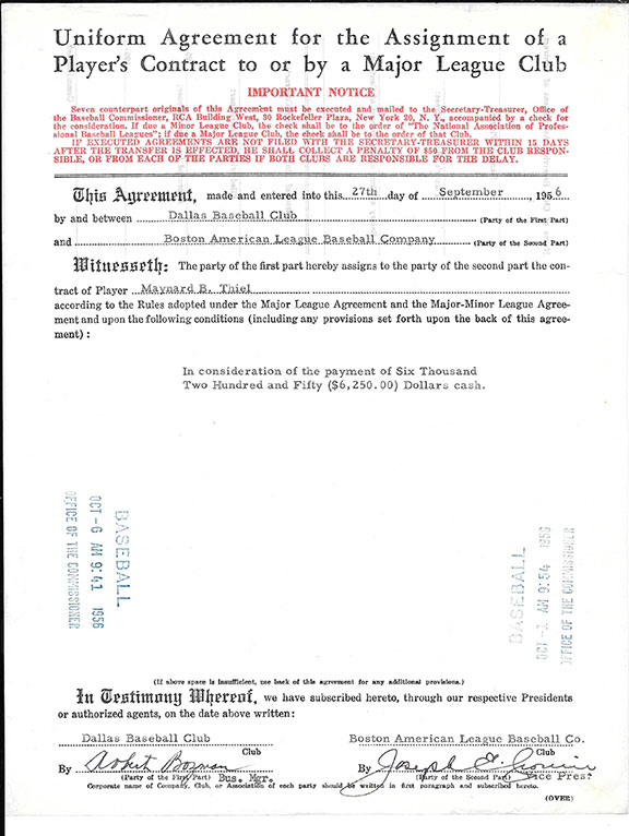 CRONIN, Joseph (1906-1984). Member of the baseball hall of Fame. Player’s Contract. 27 May 1956 for Maynard B. Theil between the Dallas Baseball Club and Boston American League Baseball Co. The trade was made for a lump sum payment of $6,250.00 in cash. Signed by Joseph Cronin as V/P of the Boston American League baseball Co. and countersigned by the business manager of the Dallas Baseball Club.............$100.00![]() |