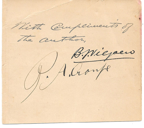 CRONJE, Pieter A. (1836-1911). South African General during the South African Republic’s military forces during the Anglo-Boer Wars of 1880-1881 and 1899-1902. He was dubbed a “Circus General” by the South African press. Later in life he joined a show at Coney Island, New York. Portion of a section of a front free endpaper of a book. Signed by the author with a 5 word sentiment. Signed just below by the subject of the book, P.A. Cronje. Not a common signature.................................$55.00